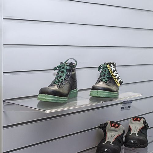 Конструкции полок для экономпанелей очень разнообразные, вы можете выбрать прямоугольные и полукруглые полки, с загибом для ценника и без, наклонные и поворотные полки для обуви.
