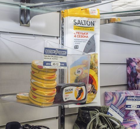 Полки и накопители используются совместно с экономпанелями, их крепления выполнены таким образом, что позволяют прочно и надежно крепиться в пазы вставок для экономпанелей.