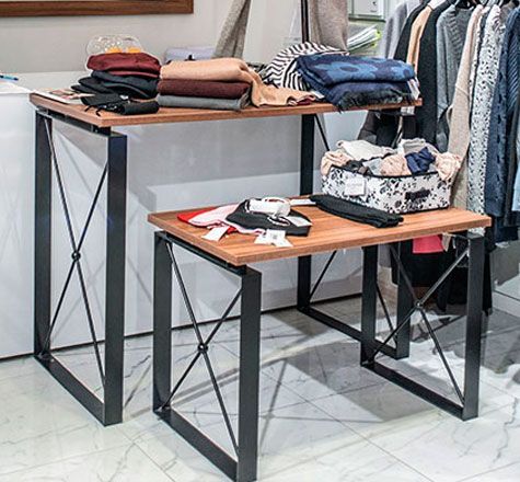 Дизайнерские столы OMT для демонстрации и выкладки товаров в торговом зале.