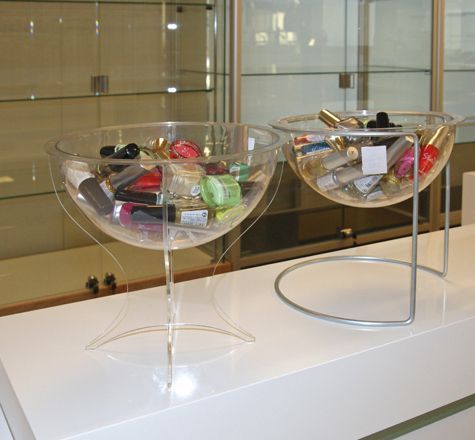В нашем ассортименте накопители настольные представлены в виде полусфер пластиковых прозрачных диаметром 200 и 300 мм и оснований. Полусферы изготовлены из ударопрочного полистирола толщиной 2 мм, что делает их надежными и крепкими, устойчивыми к повреждениям и ударам. Основание у накопителя настольного бывает из оргстекла или металла. Возможно крепление к столешнице или к полке с держателем струбциной. Накопители настольные с чашами и полусферы на струбцине используются в торговых залах аптек, магазинов косметики.