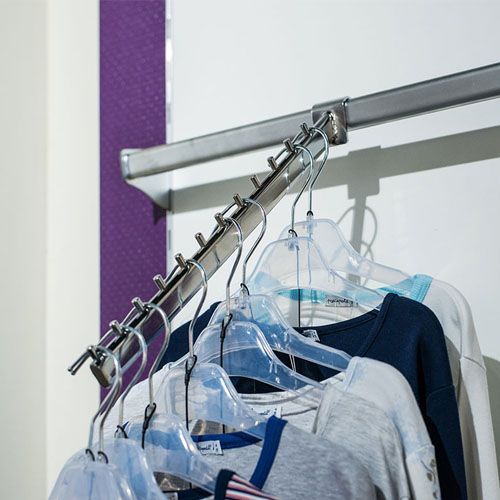 Такая штанга обеспечивает фронтальную вывеску одежды. На штангу устанавливаются специальные навесные элементы.