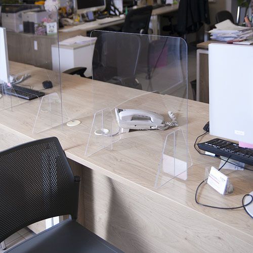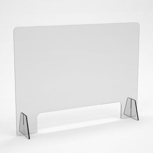 Защитный экран, для кассы, стола, прилавка. Экран состоит из плоской части с окном в нижней части экрана и ножек которые устанавливаются в пазы плоской части, поставляется в разобранном виде. Экран изготавливается из ударопрочного поликарбоната. В комплект входит двухсторонний скотч 3M, для более надежной фиксации экрана к плоскости. Упаковано в картон поштучно.